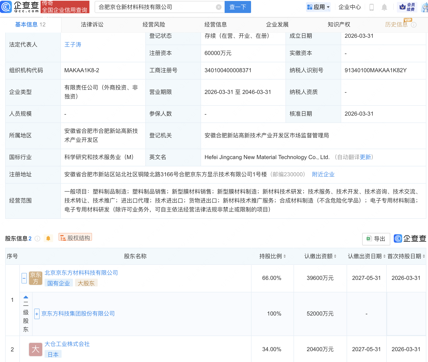 近日,合肥京仓新材料科技有限公司成立,注册资本6亿元,经营范围包含:塑料制品制造;塑料制品销售;新型膜材料销售;新型膜材料制造;新材料技术研发等。企查查股权穿透显示,该公司由京东方A(000725)全资子公司北京京东方材料科技有限公司、大仓工业株式会社共同持股。